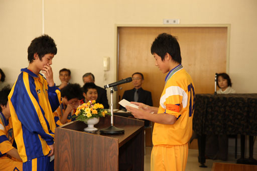 平成20年度修了式が12月7日(日) 午前10時半より、古牧公民館で行われました。 それぞれの課程を修了した中学3年生と小学6年生を、監督、コーチ、選手、保護者が送り出しました。 式では、キャプテンマークを次の学年のキャプテンに渡すセレモニーや、年間最優秀選手賞などの発表もありました。
